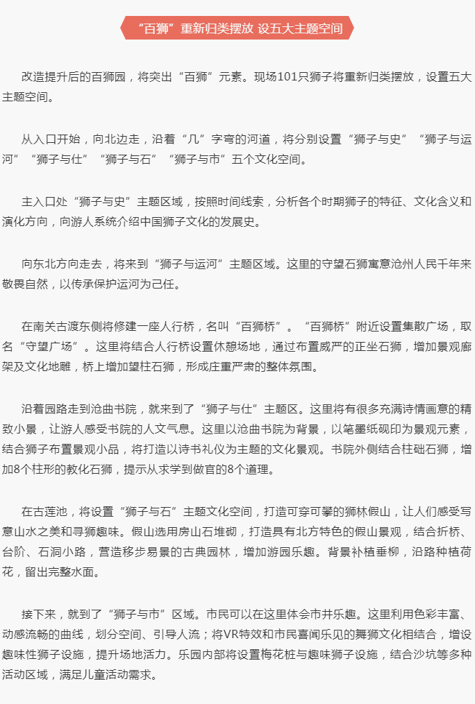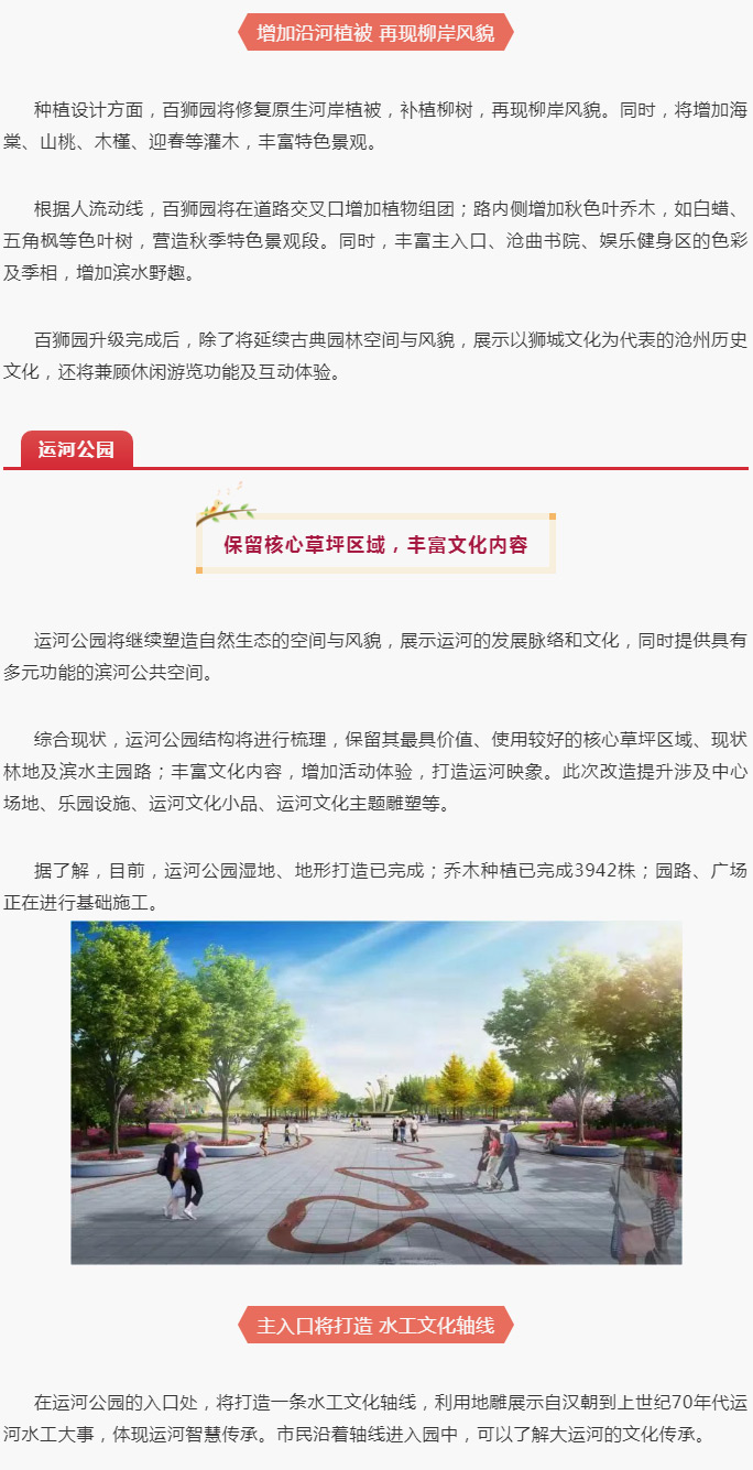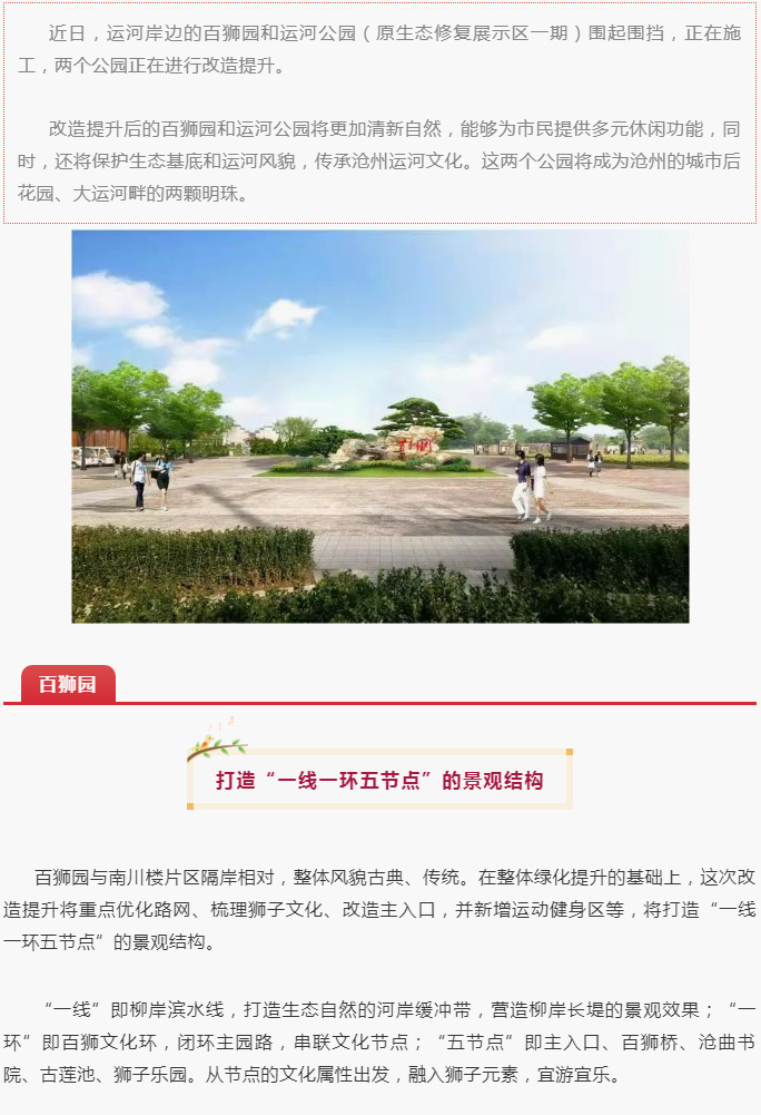 百獅園和運(yùn)河公園改造提升,建成滄州城市后花園,打造運(yùn)河畔兩顆明珠!