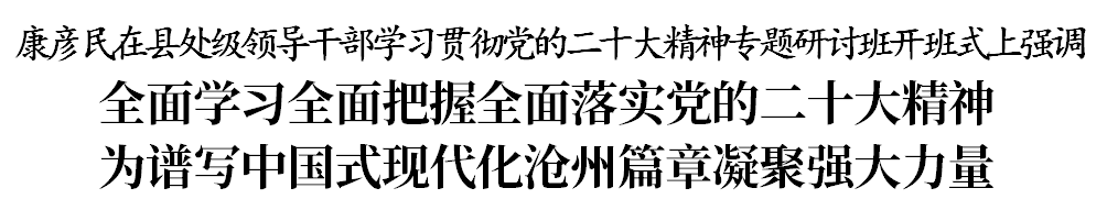 2月14日,縣處級領(lǐng)導(dǎo)干部學(xué)習(xí)貫徹黨的二十大精神專題研討班開班。市委書記康彥民作專題輔導(dǎo)報告??祻┟駨?qiáng)調(diào),要堅持以習(xí)近平新時代中國特色社會主義思想為指導(dǎo),深入學(xué)習(xí)宣傳貫徹黨的二十大精神和省委十屆二次、三次全會精神,切實做到學(xué)有所悟、學(xué)以致用、學(xué)有所成,進(jìn)一步解放思想、奮發(fā)進(jìn)取,為加快建設(shè)沿海經(jīng)濟(jì)強(qiáng)市、譜寫中國式現(xiàn)代化滄州篇章凝聚強(qiáng)大力量。市委副書記、市長向輝主持。市人大常委會主任宋有洪、市政協(xié)主席王曉燕出席。