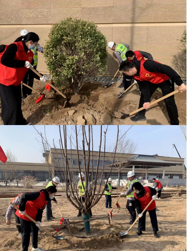 為充分發(fā)揮黨員先鋒模范作用,做好“雷鋒月”主題活動(dòng),弘揚(yáng)植綠、護(hù)綠、愛綠的文明新風(fēng),3月9日,在集團(tuán)黨委的指導(dǎo)下,建設(shè)公司黨支部聯(lián)合非遺展示中心項(xiàng)目黨支部共同開展“綠水青山 黨員先行”義務(wù)植樹主題黨日活動(dòng),黨員、預(yù)備黨員20余人參加活動(dòng)。