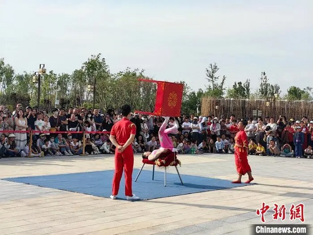 5月1日,滄州園博園內的雜技表演受到游客歡迎。朱迎慶 攝