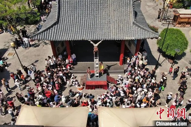 5月2日,吳橋雜技大世界景區(qū)內,雜技演員展現絕技。郝亮 攝