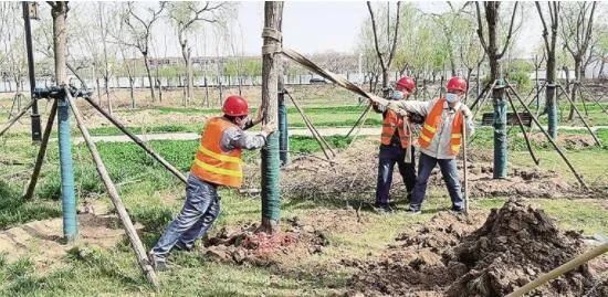 昨天上午,在百獅園植樹現(xiàn)場,一派忙碌景象。參加植樹的工人們鏟土、培土圍堰、提水澆灌,接連種下海棠、油松等樹木。