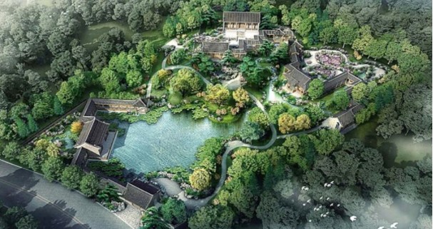 從主入口廣場(chǎng)向北眺望,鏡面般的湖水倒映遠(yuǎn)山近嶺、亭廊水榭,沿湖岸行走,可見霧噴迷離之狀,給人以疏朗寧?kù)o之感,這便是鏡湖山曉區(qū)。這個(gè)區(qū)域建筑沿湖岸布置,形成半圍合的水院,并在西南角與宮墻、璧山、亭廊結(jié)合形成瀑景,動(dòng)靜相宜、清新宜人;云山聽松區(qū),滿目的山脊松林中,水流聲聲,東西兩處泉眼為水源,沿兩道山澗匯成溪流,建筑則依山而建,與假山、曲墻圍合形成山院空間,可感受清幽、深遠(yuǎn)的山林院落氛圍。區(qū)域核心建筑松風(fēng)山堂,因山構(gòu)室,坐落于園區(qū)最高處;溪谷巖芳區(qū),地形被兩道溪澗環(huán)繞,為谷風(fēng)所匯的清涼之處。主建筑磬芳溪堂,視線開闊,三面環(huán)水,兩側(cè)連半廊,可隔花窗觀花園景色、聽溪聲潺潺,享受內(nèi)心的寧?kù)o。