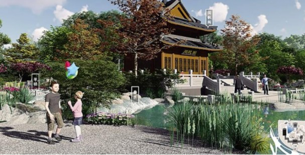 邯鄲園 ——宋云八景 河府文化 位于展園區(qū)南部、大堤?hào)|側(cè)的邯鄲園,融入大名府及運(yùn)河文化,建筑以宋風(fēng)為基調(diào),以云化名、一湖八景,營(yíng)造宋云之境。 園中營(yíng)造的8處景觀,無一不是意蘊(yùn)豐富,文化味兒十足。 隨著游人的腳步,宋云八景(以下簡(jiǎn)稱八景),依次展開。入園后,最先映入眼簾的是掛畫“偷云入畫”,框景內(nèi),園中美景盡收畫中,游人可于此處閱覽全園。然后是“白溝云源”,大名府的白溝為運(yùn)河肇始,以舟形水源暗指運(yùn)河源頭,與運(yùn)河文化相呼應(yīng)?!袄@城踏云”處,青磚墻上設(shè)計(jì)意向城墻樣的鏤空?qǐng)D案,懸掛官員簡(jiǎn)介及銅靴,有繞城祈福和樹立官員典范的作用。