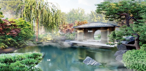 “丹青雅韻”場景,取雅集中觀畫之意境,閑坐半亭聽園內(nèi)萬壑松風(fēng),漫游長廊看玉器工藝巨著。其中,萬壑松風(fēng)處,高低起伏的臺地樹池塑造了丘壑地形,游人可于登山步道隨臺地起伏登山而上,俯瞰臺地之上遍植松林,感受萬壑松風(fēng)之意趣;“識玉雅頌”場景,取雅集中說經(jīng)之場景,后庭幽幽竹篁,跌瀑淺溪穿林而過匯入主湖面,營造出“水石潺湲,風(fēng)竹相吞”的意境。主建筑黛玉山堂則延續(xù)與繼承了傳統(tǒng)木構(gòu)建筑的黛色屋面與木屋架結(jié)構(gòu),將中國傳統(tǒng)建筑元素體現(xiàn)得淋漓盡致;“翰墨雅懷”場景,取雅集中題石之場景,黑色巨石破水而出,出園路徑穿石而過,露出光滑的石面,映襯記錄著過往的游客與美景。