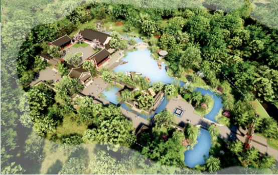 撫琴登高覽美景,于半山腰處設(shè)置停留、觀景平臺,在“臨溪撫琴”地,面對蜿蜒而下的溪水,緊鄰高處的雪浪亭,演奏一曲,高山流水遇知音;曲徑通幽把酒歡,通過園中最長的一段臨水駁岸,開闊的水面,湖景、及對岸風(fēng)光盡收眼底;古今傳承盼君歸,運(yùn)用雕塑形式展現(xiàn)蘇軾與朋友依依惜別的場景,同時一語雙關(guān),也表達(dá)游客對展園依依惜別的感情。