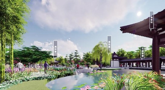 定州園 ——清泉繞石 稻浪無垠 位于展園西側(cè)的定州園,建筑為宋代風(fēng)格,講述詩人蘇軾和黑龍泉的故事,以宋代畫作中的山水關(guān)系布局建筑特征以及活動場景。包括清泉繞石迎賓至、稻浪無垠鄉(xiāng)間趣、懷古東坡湖風(fēng)愜等6個區(qū)域。 清泉繞石迎賓至,營造清泉繞石的氛圍。經(jīng)大門進(jìn)入,游人“開門見山”,清泉繞石奔涌而下,恰似定州當(dāng)年的黑龍泉,造型松樹在石縫中挺拔向上,石、松、水,交相輝映。