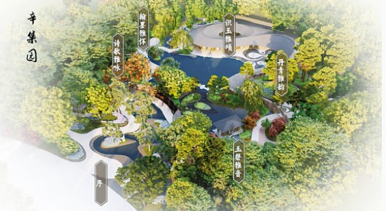 辛集園 ——玉文化園林 古韻味雅集 辛集園借《西園雅集圖》中文人雅士的5幕游園場景,提煉園林語言,以現(xiàn)代手法打造“詠、聽、畫、題、辯”五大玉文化園林空間,展現(xiàn)人文內(nèi)涵深厚的雅集新貌。 “詩歌雅詠”場景,取雅集中觀書之意境,選取詠玉詩篇于云墻之上:青瓦化山,云墻為卷,石臺為案,詩情處處融畫意;“玉磬雅音”場景,取雅集中聽琴之意境,林蔭華蓋轉(zhuǎn)譯為鄰水雅軒,軒內(nèi)懸掛最具代表的玉石樂器——玉磬復(fù)制品,聽著源自上古的玉磬之聲,臨水坐看對岸林泉山澗,頓入空谷幽蘭之境。