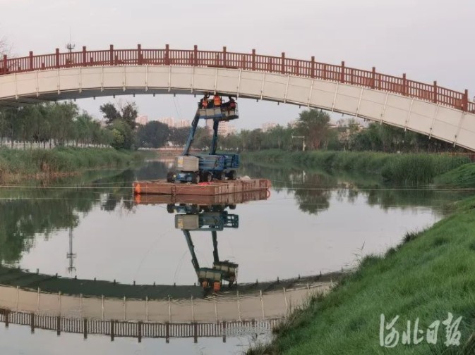 7月14日,在滄州市區(qū)大運河上,連接百獅園與南川樓文化街區(qū)的步行橋正在施工。河北日報記者張嵐山攝
