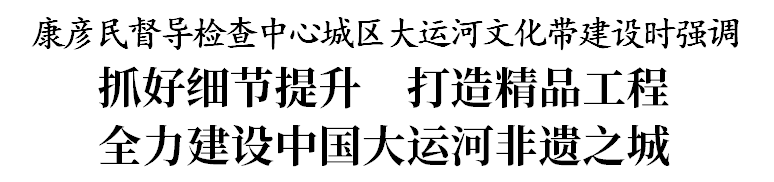 2月14日,市委書記康彥民就中心城區(qū)大運(yùn)河文化帶建設(shè)進(jìn)行督導(dǎo)檢查??祻┟駨?qiáng)調(diào),黨的二十大報(bào)告提出“加大文物和文化遺產(chǎn)保護(hù)力度”,要深入學(xué)習(xí)貫徹黨的二十大精神和習(xí)近平總書記重要指示批示精神,全面落實(shí)黨中央決策部署和省委、省政府工作要求,以大運(yùn)河文化帶重點(diǎn)項(xiàng)目建設(shè)為引領(lǐng),抓好細(xì)節(jié)提升,打造精品工程,全力建設(shè)中國大運(yùn)河非遺之城。