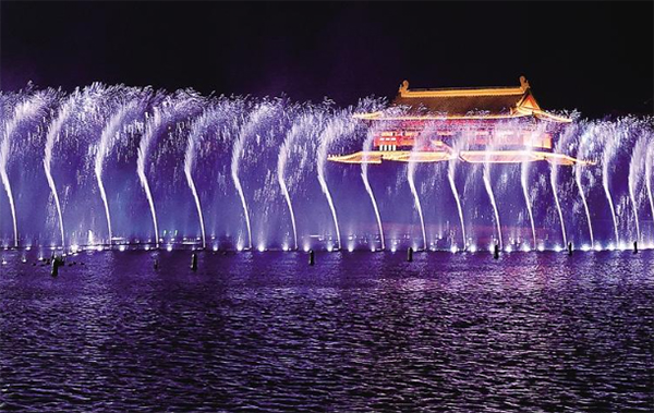 走進吳橋雜技大世界景區(qū),五湖四海的游客云集于此。蹬大缸、頂方桌、上刀山、吹嗩吶、獨輪車、古彩戲法、魔術雜?!实谋硌葺喎详?,引得游客掌聲四起。省級非物質(zhì)文化遺產(chǎn)雜技嗩吶代表性傳承人“吹破天”何樹森,是吳橋雜技大世界“新江湖八大怪”之一。在“吹破天”劇場,何樹森頭頂暖水壺吹嗩吶,不但能用嘴吹還能用鼻子吹,甚至還能吹茶壺,將雜技與嗩吶完美結合?!按筮\河在吳橋縣穿境而過,賦予了‘雜技之鄉(xiāng)’別樣韻味。這些年,我通過演出不斷展現(xiàn)非遺魅力,同時手把手教學授藝,希望把這門技藝永久傳承下去?!焙螛渖f。這兩年,我市還精心創(chuàng)作文學藝術精品,組織“大運·長歌”長幅畫卷和“大運河·故鄉(xiāng)情”主題歌曲創(chuàng)作,編印中國大運河(滄州段)非遺攝影集萃,舉辦2022年“文化和自然遺產(chǎn)日”暨滄州市非遺購物節(jié),讓大運河更加流光溢彩,以文化引領高質(zhì)量發(fā)展。突出科學利用,創(chuàng)新融合發(fā)展思路走進園博園,伴隨悠揚的音樂聲響起,映月湖中一簇簇水柱噴涌而出,瞬間形成數(shù)十米高的噴泉水簾,時而剛勁有力,時而婀娜多姿。在噴泉水簾的舞動與環(huán)繞下,包含滄州鐵獅子、武術等文化符號的水幕電影正式上演。一時間,水柱、燈光、音樂、激光……多種元素交相輝映,為市民帶來一場視聽盛宴。
