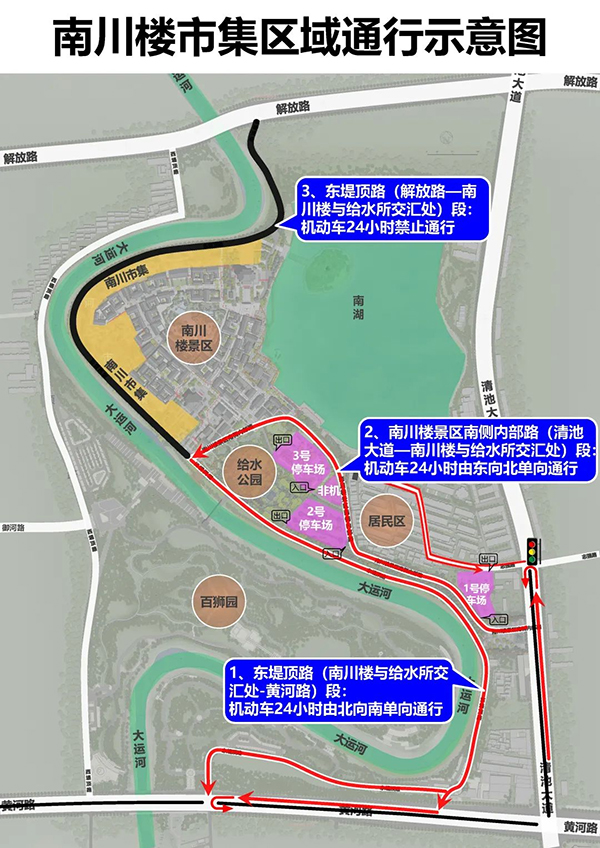 2.南川樓景區(qū)南側內部路(清池大道—南川樓與給水所交匯處)實行機動車輛24小時由東向北單向通行。