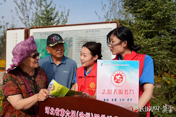志愿者在園博園發(fā)放景區(qū)宣傳手冊。長城網(wǎng)·冀云客戶端記者 崔上 攝