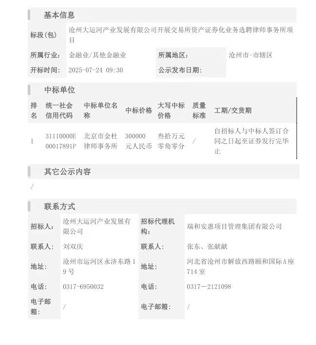 滄州大運(yùn)河產(chǎn)業(yè)發(fā)展有限公司開展交易所資產(chǎn)證券化業(yè)務(wù)選聘律師事務(wù)所項(xiàng)目